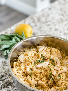 Boil a pot of salted water, and cook orzo pasta as directed. Once al dente, drain & stir in 2 Tbsp olive oil (to prevent sticking). While pasta cooks, season the chicken tenders with salt, pepper, & garlic powder. Then in a large skillet (non-stick), over medium-high heat, add olive oil. When oil is hot, cook chicken tenders just until cooked (2-3 minutes per side). Remove chicken from pan and keep warm. In the same skillet, add butter over medium high heat. Once melted, add garlic & onion, stirring 1-2 minutes. Add cooking wine, deglaze pan by scraping bits loose with your spatula. Reduce liquid by half (about 3 minutes). Add lemon juice & turn off heat. In a large serving bowl, toss with grated parmesan, onion/garlic mixture, basil leaves & salt/pepper to taste. Finally chop chicken into bite sized pieces & add in. Mix well. We love this warm or cold! ENJOY!!